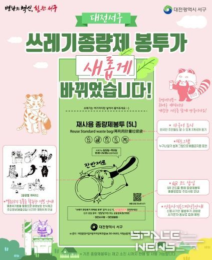 스페이스뉴스 스페이스뉴스 기자 | 대전 서구는 환경 보호 의식을 높이고 불법 투기 과태료 스미싱(문자 결제 사기) 범죄를 예방하기 위해, 오는 3월부터 쓰레기 종량제 봉투 디자인을 전면 재단장한다.