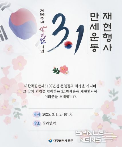 스페이스뉴스 스페이스뉴스 기자 | 대구 중구는 3월 1일 제106주년 삼일절을 맞아 삼일절의 역사적 의미를 되새기고 순국선열의 숭고한 희생정신을 기리기 위해 청라언덕과 3.1만세운동길, 이상화·서상돈 고택 일원에서 ‘3.1만세운동 재현행사’를 개최한다.