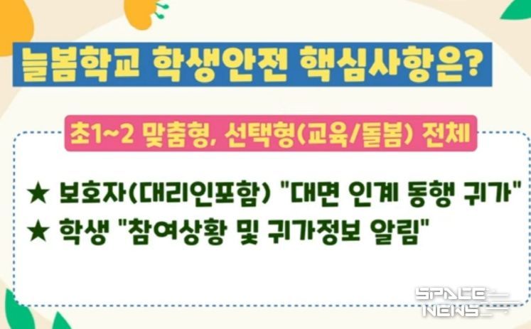 스페이스뉴스 스페이스뉴스 기자 | 대구시교육청은 ‘대구늘봄학교 학생귀가안전 관리 강화 계획’을 발표하고,‘늘봄학교 학생안전관리 안내 영상’을 제작해 늘봄학교로 배포한다고 밝혔다.