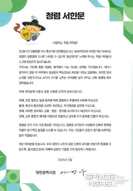 스페이스뉴스 스페이스뉴스 기자 | 전시는 공정하고 투명한 행정을 실현하고, 청렴한 공직문화를 확립하기 위해‘청렴 서한문’을 발표했다.