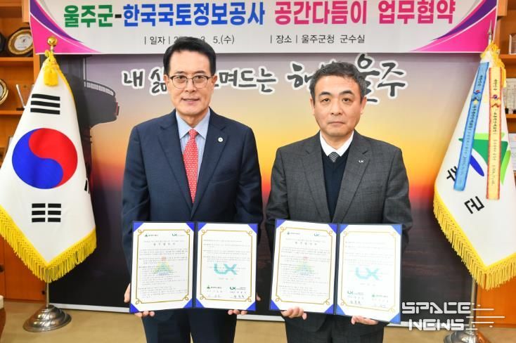스페이스뉴스 스페이스뉴스 기자 | 울산 울주군이 5일 군청 소회의실에서 한국국토정보공사(부산울산지역본부)와 올해 공간정보 행정지원 사업 추진을 위한 ‘공간다듬이 서비스’ 업무협약을 체결했다.
