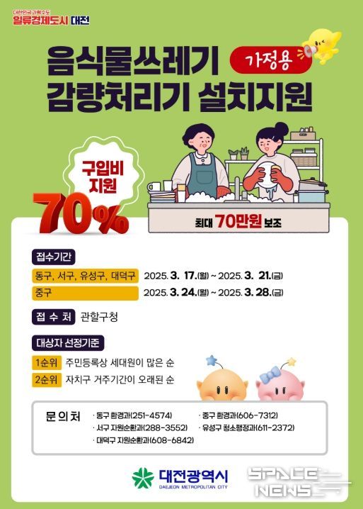 스페이스뉴스 스페이스뉴스 기자 | 대전 동구는 가정에서 발생하는 음식물쓰레기를 줄이고 배출 편의를 제공하기 위해 ‘가정용 음식물쓰레기 감량처리기 지원사업’을 추진, 이달 17일부터 21일까지 지원 신청을 받는다고 10일 밝혔다.