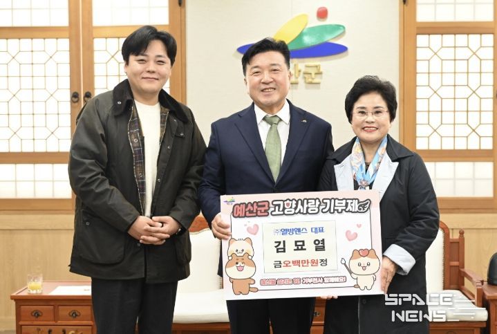 스페이스뉴스 스페이스뉴스 기자 | ㈜열방휀스 김묘열 대표가 지난 13일 예산군에 고향사랑기부금 500만원을 기탁했다.