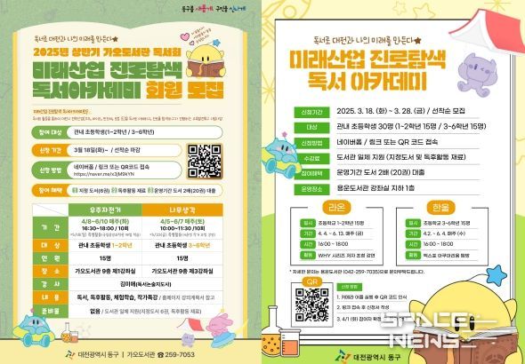 스페이스뉴스 스페이스뉴스 기자 | 대전 동구는 관내 공공도서관인 가오·용운도서관에서 ‘2025년 상반기 미래산업 진로탐색 독서아카데미’를 운영, 이달 18일부터 참여 회원을 모집한다고 밝혔다.