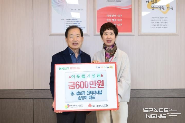 스페이스뉴스 스페이스뉴스 기자 | 설보광 인터내셔널에서 지난 13일 서구청을 방문하여 관내 저소득 장애인들을 위해 사용해 달라며 이웃돕기 성금 600만원을 기탁했다.