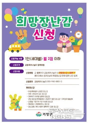 거창군 공동육아나눔터 등록회원이면 누구나 신청할 수 있으며, 군 홈페이지 공동육아나눔터란의 ‘희망장난감 신청’ 게시판을 통해 간편하게 신청하면 된다.