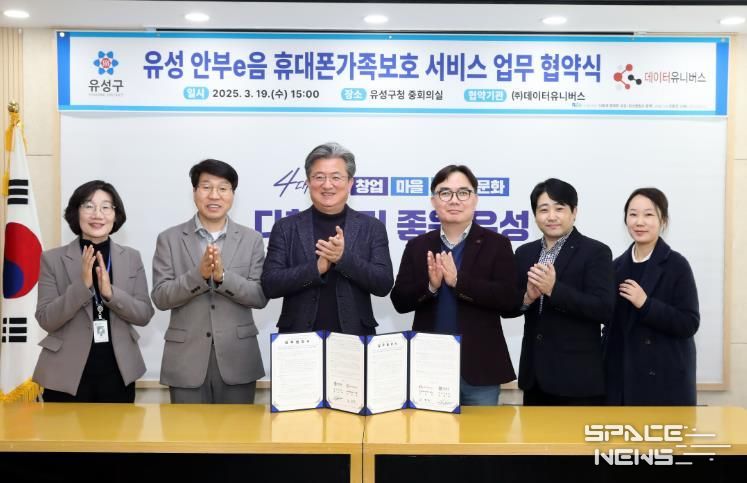 스페이스뉴스 스페이스뉴스 기자 | 대전 유성구는 19일 ㈜데이터유니버스와 스마트폰을 활용한 ‘유성 안부e음’ 휴대폰 가족보호 서비스 업무 협약을 체결했다.