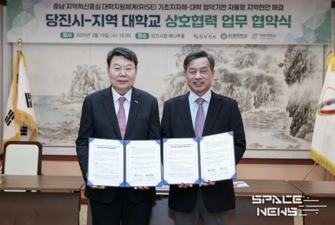 스페이스뉴스 스페이스뉴스 기자 | 당진시는 19일 당진시청 내 해나루홀에서 신성대학교 및 세한대학교와 지역 현안 해결 추진을 위한 ‘지역혁신중심 대학지원체계(RISE)' 업무협약식을 진행했다고 20일 밝혔다.