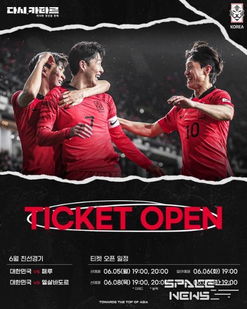 스페이스뉴스 관리자 기자 | 대한축구협회는 페루와 엘살바도르를 상대로 치르는 '하나은행 초청 축구국가대표팀 친선경기' 입장권을 5일부터 차례로 판매한다고 밝혔다. 클린스만 감독이 이끄는 축구대표팀은 오는 16일 부산아시아드주경기장에서 페루와, 20일 대전월드컵경기장에서 엘살바도르와 맞붙는다. 두 경기 모두 저녁 8시에 킥오프된다.