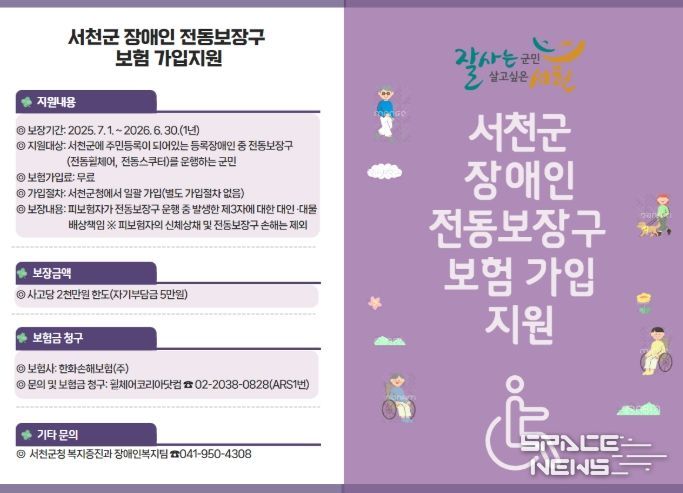 스페이스뉴스 스페이스뉴스 기자 | 서천군은 전동보장구(전동휠체어, 전동스쿠터)를 이용하는 장애인의 안전과 권익 보호를 위해 ‘장애인 전동보장구 배상책임보험’ 가입을 지원한다.