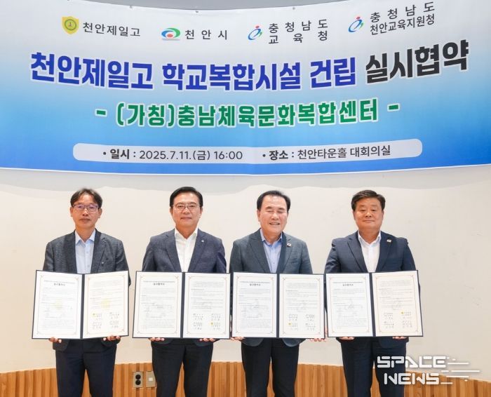스페이스뉴스 스페이스뉴스 기자 | 충남교육청은 11일, 천안 타운홀에서 천안시청, 천안교육지원청, 천안제일고등학교와 함께 천안제일고 학교복합시설인 '충남체육문화복합센터' 건립을 위한 실시협약을 체결했다.