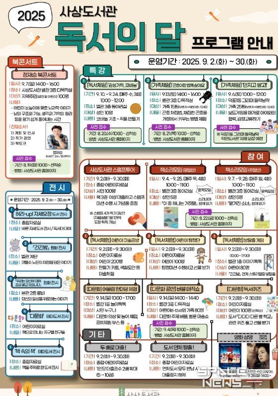 스페이스뉴스 스페이스뉴스 기자 | 부산 사상구는 오는 9월 2일부터 30일까지 한 달간 사상도서관과 주례열린도서관에서 특강·공연·전시 등 주민이 함께 즐길 수 있는 풍성한 독서문화 행사를 개최한다고 밝혔다.