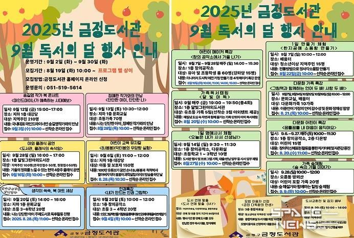 금정구 도서관 관계자는“9월 독서의 달을 맞아 다양한 행사를 통해 도서관이 열린 문화공간으로 자리매김하고, 지역민들의 책과 한층 더 가까워지기를 기대한다.”라고 전했다.
