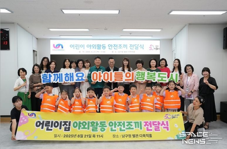 스페이스뉴스 스페이스뉴스 기자 | 부산광역시 남구는 개청 50주년을 맞아 관내 모든 어린이집 아동의 안전한 야외 활동을 위해 안전조끼를 제작·배부하고, 이를 기념하는 안전조끼 전달식을 지난 8월 21일 남구청 별관 다목적홀에서 개최했다.