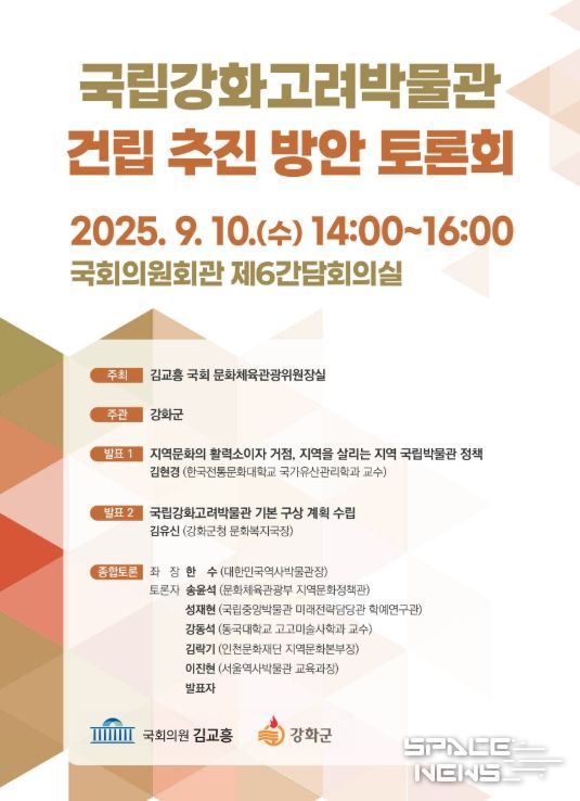 스페이스뉴스 스페이스뉴스 기자 | 강화군은 김교흥 국회의원실에서 주최하고, 강화군이 주관하는 '국립강화고려박물관 건립 추진 방안 토론회'가 오는 9월 10일 국회의원회관 제6간담회실에서 열린다고 밝혔다.