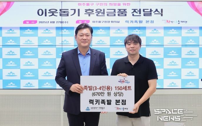 스페이스뉴스 스페이스뉴스 기자 | 인천 미추홀구는 27일 구청장실에서 럭키족발 본점(대표 이호현)으로부터 지역 내 저소득 가구 지원을 위한 족발 150세트(3~4인용)를 전달받았다.