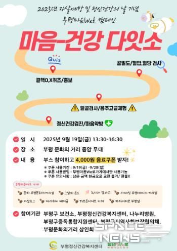 스페이스뉴스 스페이스뉴스 기자 | 부평구 부평정신건강복지센터는 오는 19일 부평 문화의 거리 중앙무대에서 2025년 자살예방 및 정신건강의 날 기념 ‘부평마음We로(路) 캠페인 마음-건강 다잇소’를 진행한다.