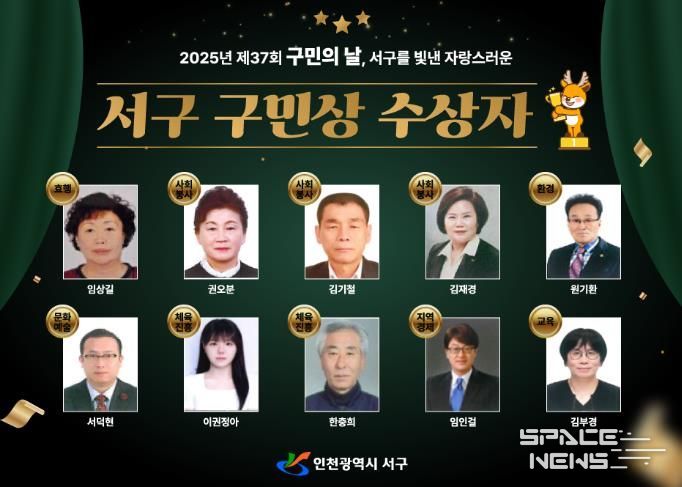 스페이스뉴스 스페이스뉴스 기자 | 인천 서구는 제37회 구민의 날을 맞아 지역사회 발전과 구민 화합에 헌신한 2025년 구민상 수상자 10명을 선정했다고 2일 밝혔다.