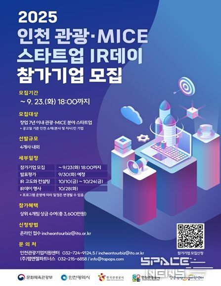 스페이스뉴스 스페이스뉴스 기자 | 인천광역시와 인천관광공사는 오는 10월 28일에 개최되는 ‘2025 인천 관광・마이스(MICE) 스타트업 투자유치 설명회(IR 데이)’참가기업을 오는 9월 23일까지 모집한다고 밝혔다.