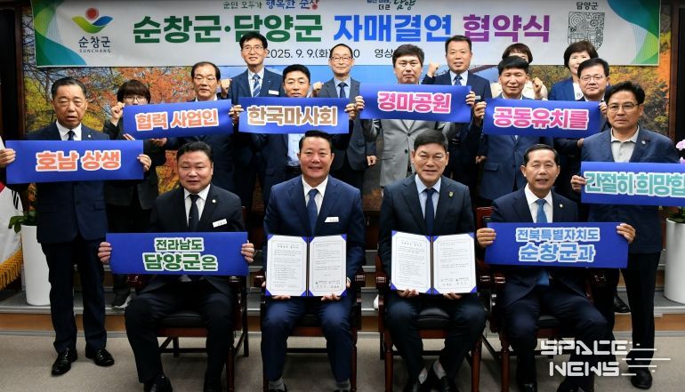 스페이스뉴스 스페이스뉴스 기자 | 전라남도 담양군과 전북특별자치도 순창군은 9일 순창군 영상회의실에서 자매결연 협약을 맺고 상생발전과 우호교류 강화를 약속했다.