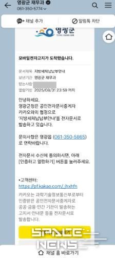 스페이스뉴스 스페이스뉴스 기자 | 영광군은 지난 8월 5일에 이어 오는 9월 11일, 지방세 납부 기한을 넘긴 체납자를 대상으로 **'카카오 알림톡'**을 활용한 모바일 전자고지 2차 전송을 시행한다고 밝혔다.