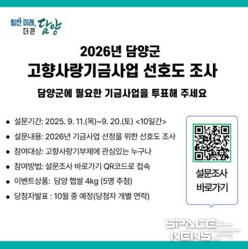 스페이스뉴스 스페이스뉴스 기자 | 담양군은 2026년 고향사랑기금사업 선정에 기부자와 군민의 의견을 반영하기 위해 11일부터 20일까지 10일간 ‘담양군 고향사랑기금사업 선호도조사’를 진행한다.