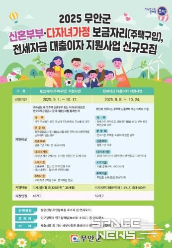 스페이스뉴스 스페이스뉴스 기자 | 전남 무안군이 신혼부부와 다자녀가정의 주거비 부담을 줄이고 안정적인 정착을 돕기 위해 ‘전세자금 및 주택구입 대출이자 지원사업’을 본격 추진한다.