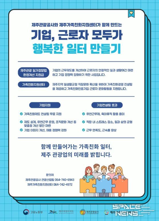 스페이스뉴스 스페이스뉴스 기자 | 제주특별자치도와 제주관광공사(사장 고승철)는 도내 관광업계의 근무환경을 개선하고 근로자의 안정적인 일·생활 균형을 지원하기 위해 최근 제주가족친화지원센터(센터장 강문실)와 가족친화제도 컨설팅을 추진하고 있다고 16일 밝혔다.