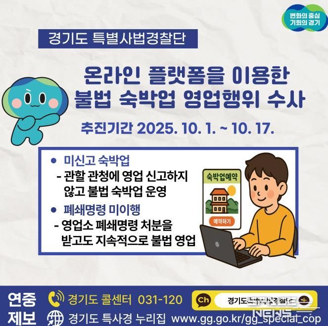 스페이스뉴스 스페이스뉴스 기자 | 경기도가 10월 1일부터 17일까지 3주간 온라인 공유 숙박 플랫폼을 이용해 오피스텔 등에서 불법 숙박업을 운영하는 미신고 업소를 집중 단속한다.