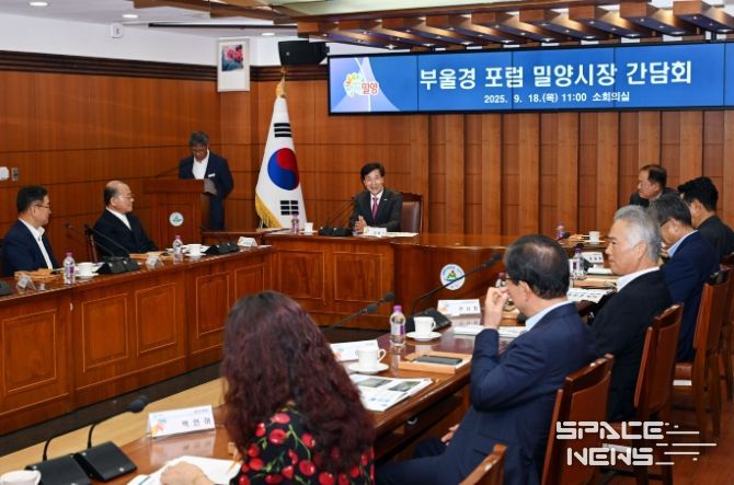 스페이스뉴스 스페이스뉴스 기자 | 경남 밀양시는 18일 시청 소회의실에서 부울경 포럼 박병대 회장을 비롯한 회장단 10명과 함께 지역균형발전 방안, 나노융합 국가산업단지 활성화, 부울경 지역발전을 위한 상호 협력 방안을 논의했다고 밝혔다.