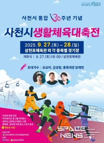 스페이스뉴스 스페이스뉴스 기자 | 사천시는 시 통합 30주년을 기념해 오는 9월 27일부터 28일까지 이틀간 삼천포체육관 및 시 전역의 종목별 경기장에서 ‘사천시생활체육대축전’을 개최한다고 23일 밝혔다.
