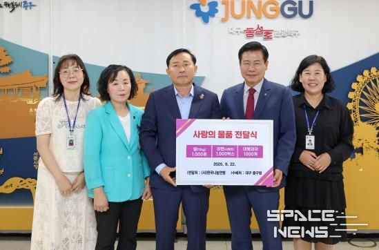 스페이스뉴스 스페이스뉴스 기자 | 대구 중구는 사단법인 한국나눔연맹(대표 안지애)가 지난 22일 대구 중구청을 방문해 추석 명절을 맞아 백미(10kg) 1,000포, 라면(12개입) 1,000박스, 간식(쌀과자 50봉) 1,000박스 등 이웃돕기 성품을 기탁했다고 밝혔다.