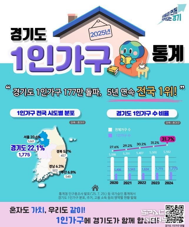 스페이스뉴스 스페이스뉴스 기자 | 경기도 1인가구는 177만 가구이며, 도 전체 가구 가운데 31.7%를 차지하고 있는 것으로 나타났다. 경기도의 1인가구 수는 2020년부터 매년 전국 최고치를 경신하고 있다.