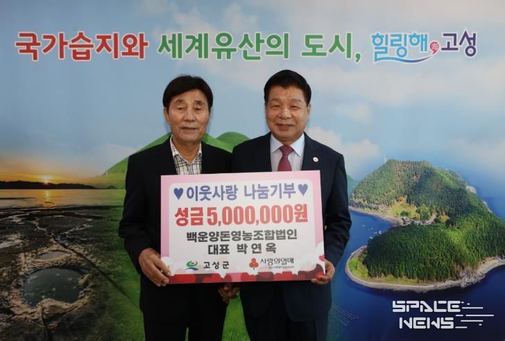 스페이스뉴스 스페이스뉴스 기자 | 고성군 대가면 소재 백운양돈영농조합법인 박연옥 대표는 9월 23일 고성군청을 방문하여 추석 명절을 맞아 어려운 이웃을 위해 써달라며 성금 500만 원을 기탁했다.