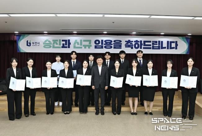 스페이스뉴스 스페이스뉴스 기자 | 부천시는 지난 23일 부천시청 소통마당에서 2025년 10월 1일자 인사발령에 따른 임용장 수여식을 열고, 5급 승진자 2명(직원복지과 후생복지팀장 박미경, 주차지도과 주차행정팀장 이순임)과 신규 임용자 16명에게 임용장을 전달했다.
