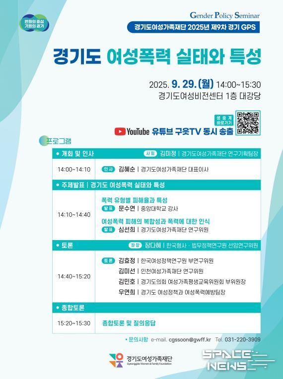 스페이스뉴스 스페이스뉴스 기자 | 경기도여성가족재단은 29일 오후 2시 경기도여성비전센터 1층 대강당에서 ‘경기도 여성폭력 피해 실태와 특성’을 주제로 정책토론회를 개최한다.