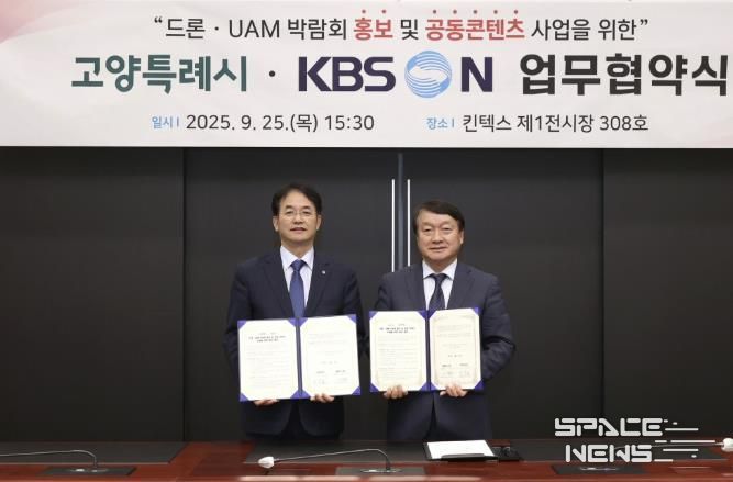 스페이스뉴스 스페이스뉴스 기자 | 고양특례시는 지난 25일 고양 킨텍스에서 KBS N과‘드론·도심항공모빌리티(UAM) 박람회 홍보 및 공동 콘텐츠 사업을 위한 업무협약(MOU)’을 체결했다고 밝혔다.