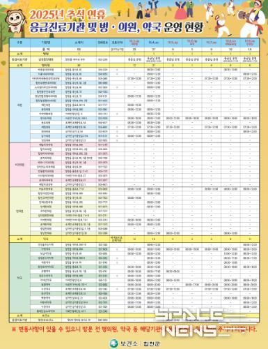 스페이스뉴스 스페이스뉴스 기자 | 합천군은 추석 명절 연휴기간(10. 3. ~ 10. 9.)동안 응급환자대비 및 군민과 귀성객의 의료공백을 최소화하고자 응급의료기관 및 문 여는 병의원‧약국을 지정‧운영한다.