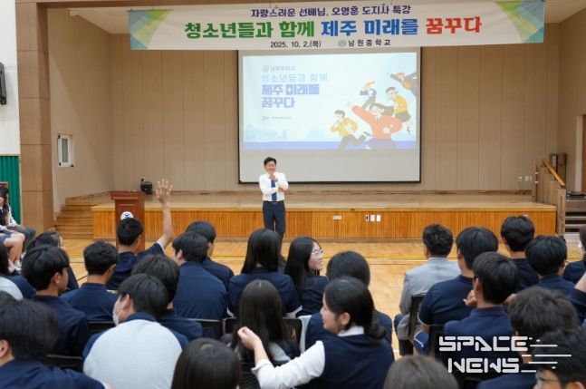 스페이스뉴스 스페이스뉴스 기자 | 오영훈 제주특별자치도지사는 2일 남원중학교(교장 오경석)를 찾아 전교생을 대상으로 특별강연을 열고, “남원과 제주를 넘어 아시아, 나아가 우주까지 여러분의 무대가 돼야 한다”며 청소년들의 꿈과 도전을 격려했다.