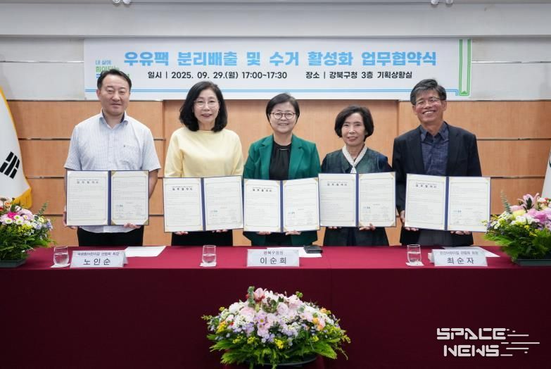 스페이스뉴스 스페이스뉴스 기자 | 서울 강북구는 9월 29일(월) 구청 기획상황실에서 강북구어린이집연합회와 어진이마을관리 사회적협동조합과 함께 우유팩 분리배출 및 수거 활성화 기반 구축을 위한 업무협약을 체결했다고 밝혔다.