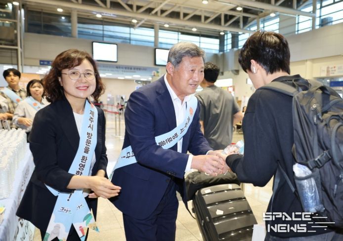 스페이스뉴스 스페이스뉴스 기자 | 김완근 제주시장은 2일 제주항국제여객터미널에서 추석 황금연휴를 맞아 제주를 찾은 귀성객과 관광객을 환영했다.