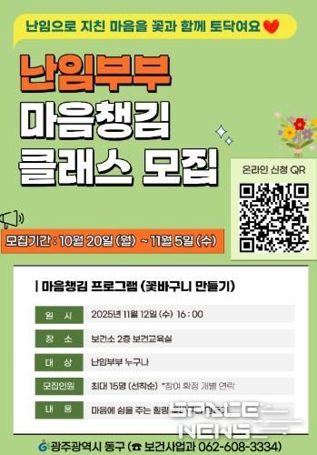 스페이스뉴스 스페이스뉴스 기자 | 광주 동구는 난임으로 어려움을 겪고 있는 부부들의 심리적 안정을 돕기 위해 오는 11월 12일 ‘난임부부 마음챙김 클래스’를 운영한다고 밝혔다.