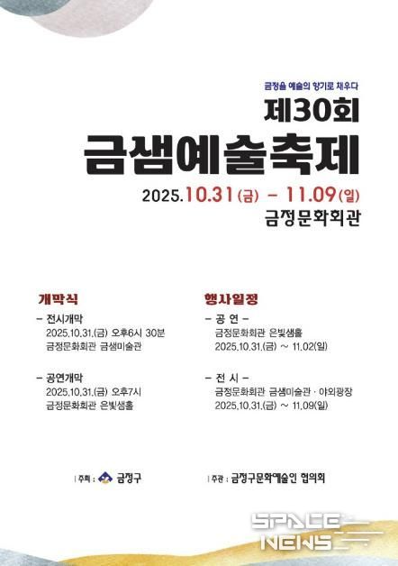 스페이스뉴스 스페이스뉴스 기자 | 부산시 금정구가 주최하고 금정구 문화예술인협의회(회장 도태근)가 주관하는 10월 31일부터 11월 9일까지 금정문화회관 은빛샘홀, 금샘미술관 전시실, 야외광장에서 ‘제30회 금샘예술축제’를 개최한다.