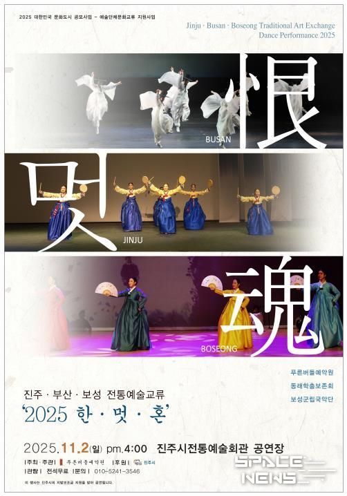 스페이스뉴스 스페이스뉴스 기자 | 경상국립대학교 인문대학 민속예술무용학과 남선희 외래교수가 대표를 맡고 있는 ‘푸른버들예악원’은 11월 2일 오후 4시 진주시전통예술회관(진양호) 공연장에서 진주·부산·보성 전통예술교류 ‘2025 恨·멋·魂’ 행사를 개최한다.