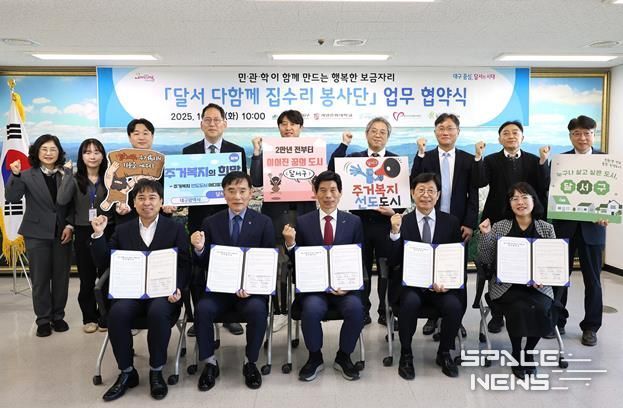 스페이스뉴스 스페이스뉴스 기자 | 대구 달서구는 28일 구청에서 5개 기관이 참여한 가운데 ‘달서 다함께 집수리 봉사단’ 업무협약식을 열고, 기술 봉사와 복지 서비스를 결합한 새로운 상생형 주거복지 모델의 출발을 알렸다.