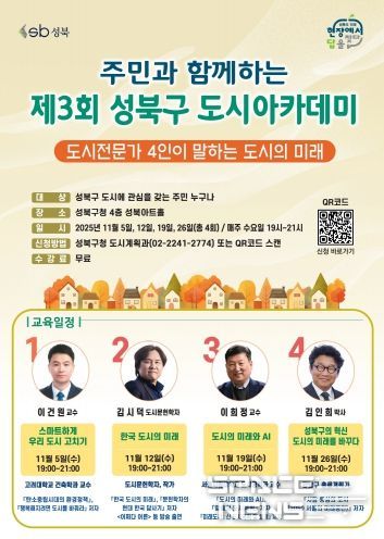 스페이스뉴스 스페이스뉴스 기자 | 서울 성북구가 우리나라를 대표하는 도시 전문가 4인을 초빙해 도시의 모든 것을 알려주는 ‘제3회 성북구 도시아카데미’를 진행한다.
