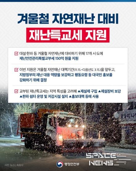 스페이스뉴스 스페이스뉴스 기자 | 겨울철 자연재난 대비 재난특교세 지원