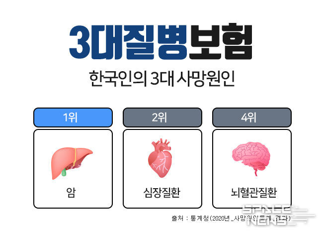 스페이스뉴스 스페이스뉴스 기자 | 흔히 3대질병이라 일컫는 암, 심혈관질환, 뇌혈관질환은 통계청 발표자료에 따르면 한국인의 주요 사망원인 중에서 3위 폐렴을 제외하고 1~4위를 차지하고 있으며, 이전부터 지금까지도 살면서 가장 먼저 대비해야 하는 치명적인 질병으로 강조되고 있다. 이러한 중대질병에 대비하기 위하여 상기 세가지 치명적인 질병을 집중보장하는 3대질병진단비보험을 많이 가입하고 있다. 3대진단비보험은 각각의 질병을 중점적으로 보장하면서도 가입자 특성에 맞는 특약을 추가함으로써 종합건강보험으로도 활용할 수가 있다.