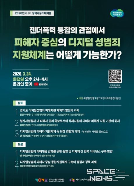 스페이스뉴스 스페이스뉴스 기자 | 경기도와 경기도젠더폭력통합대응단은 24일 오후 2시 ‘젠더폭력 통합의 관점에서 피해자 중심의 디지털 성범죄 지원체계는 어떻게 가능한가?’라는 주제로 2026년 제1차 정책라운드테이블을 개최한다.