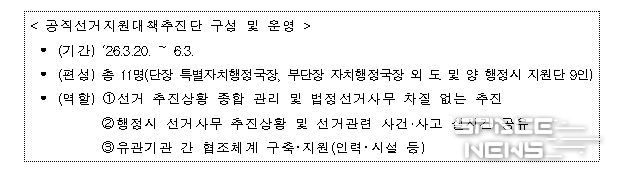 소통청렴담당관이 총괄하고 3개 반 10명의 감찰 인력이 투입되며, 공직자의 선거중립 의무 위반, 민생현안 방치, 선심성 예산집행, 공직기강 해이 등을 집중 점검한다.